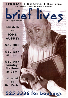 Patrick Garland has condensed the memoirs of John Aubrey, a seventeenth Century chronicler and gossip into a solo play. Having spent a lifetime collecting scholarly information and scandalous gossip, the aged Aubrey ignores, involves and entertains us by turn, while he reminisces through a whole day in this antiquarian, dilapidated, memory choked boarding house chamber. Under the direction of Ken Porter, Rex Steele recreated some of the magic that they both experienced on first seeing the play performed thirty years earlier.