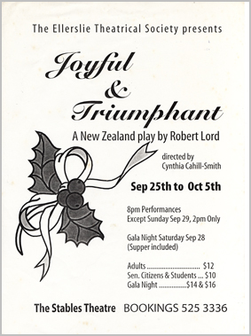 Joyful & Triumphant written by Robert Lord directed by Cynthia Cahill-Smith 25 September to 5 October 1996 Cast Dad - George Bishop Rex Steele Mum - Lyla Bishop Val Hemphill Rose Bishop Margarita Green Ted Bishop Garry Stewart Brenda Bishop Jan Cosslett Raewyn Bishop Sonia Waller Alice Bishop Margaret O'Shea